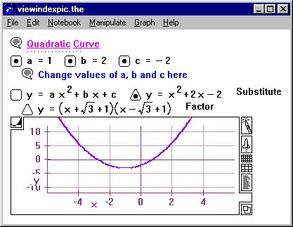 LiveMath is interactive. By changing the value of a variable, all the algebraic equations and graphs linked to the variable will also change automatically and instantaneously. The picture on the right shows an example of the factorisation and the graph of a quadratic expression.